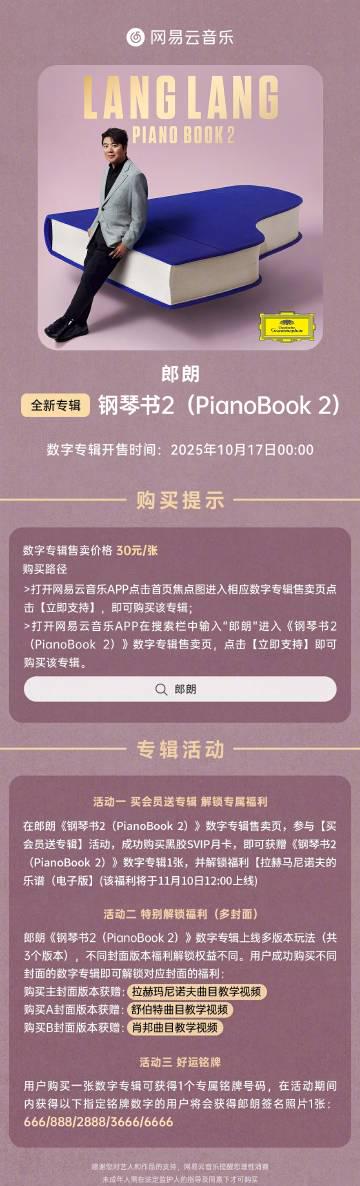 說到郎朗的新專輯,它將在10月17日於網易雲音樂正式上線。《鋼琴書2》延續了前作的精神,融合了經典小品、當代新古典作品,甚至還有遊戲和影視的熱門音樂。郎朗稱這些為「微型傑作」,絕對是鋼琴愛好者的必聽之選!專輯還支持多封面玩法,買不同封面就能解鎖教學視頻,更有買SVIP送數專等福利,參與活動還有機會拿到親筆簽名照呢。