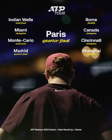 💡更令人驚豔的是,辛納今年完成了驚人的「大師賽全八強」成就。從印第安維爾斯的四強、邁阿密奪冠,到蒙特卡洛四強、馬德里八強,再到羅馬打進決賽,加拿大和辛辛那提連續稱王,上海站奪冠,如今巴黎又闖進八強——這樣的全面表現,在當今網壇實屬罕見。